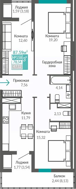 Продаётся 3-комнатная квартира в строящемся доме (С7), срок сдачи: III-кв. 2027, общей площадью 78.54 кв.м., на 5 этаже. Жилой квартал "Абрикос" - начало яркой истории жизни в прогрессивном районе Симферополя - Семья городских кварталов "Крымская Роза".