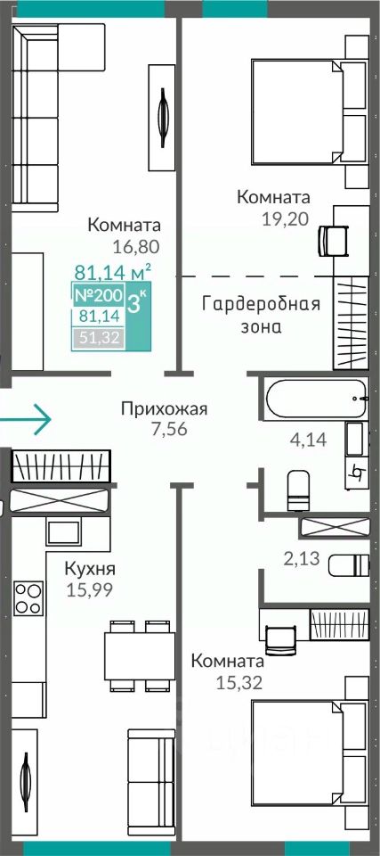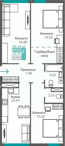 Продаётся 3-комнатная квартира в строящемся доме (С7), срок сдачи: III-кв. 2027, общей площадью 81.14 кв.м., на 2 этаже. Жилой квартал "Абрикос" - начало яркой истории жизни в прогрессивном районе Симферополя - Семья городских кварталов "Крымская Роза".