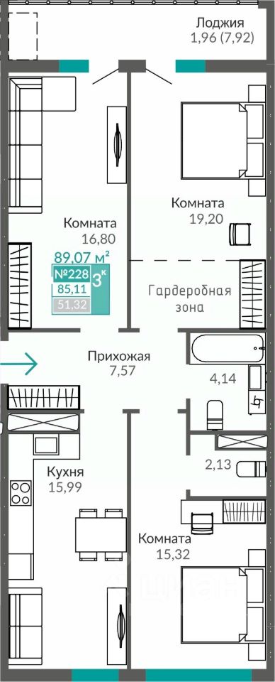 Продаётся 3-комнатная квартира в строящемся доме (С7), срок сдачи: III-кв. 2027, общей площадью 85.11 кв.м., на 6 этаже. Жилой квартал "Абрикос" - начало яркой истории жизни в прогрессивном районе Симферополя - Семья городских кварталов "Крымская Роза".