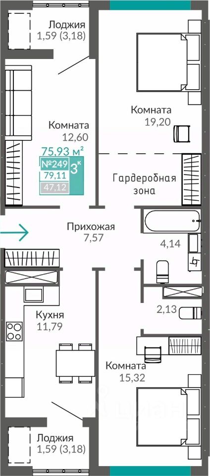 Продаётся 3-комнатная квартира в строящемся доме (С7), срок сдачи: III-кв. 2027, общей площадью 75.93 кв.м., на 9 этаже. Жилой квартал "Абрикос" - начало яркой истории жизни в прогрессивном районе Симферополя - Семья городских кварталов "Крымская Роза".