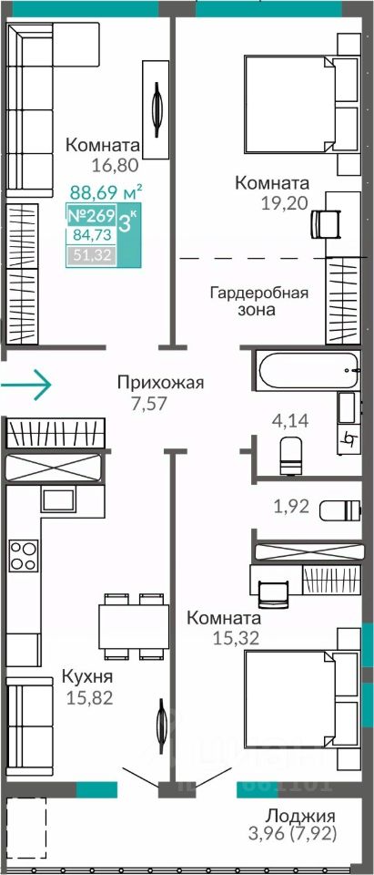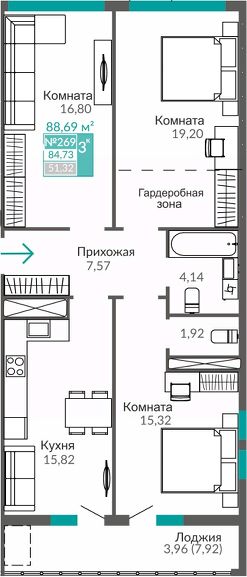 Продаётся 3-комнатная квартира в строящемся доме (С7), срок сдачи: III-кв. 2027, общей площадью 84.73 кв.м., на 3 этаже. Жилой квартал "Абрикос" - начало яркой истории жизни в прогрессивном районе Симферополя - Семья городских кварталов "Крымская Роза".
