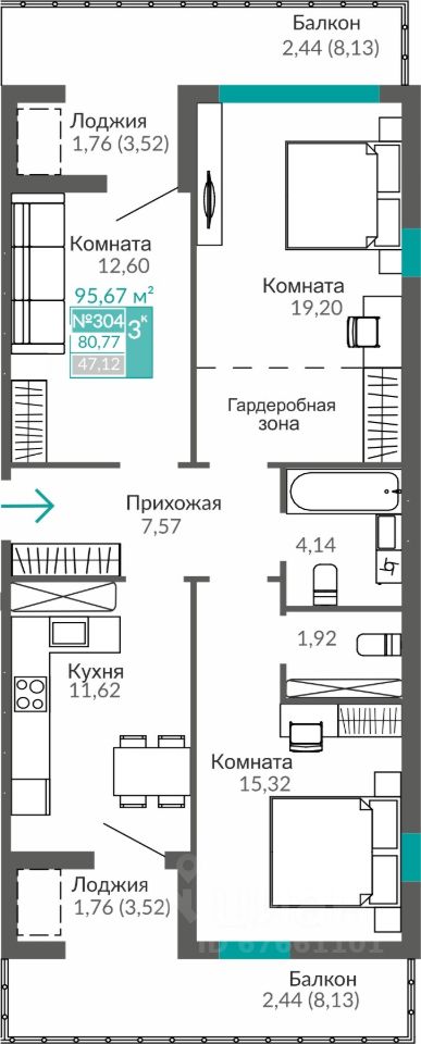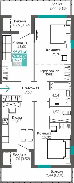 Продаётся 3-комнатная квартира в строящемся доме (С7), срок сдачи: III-кв. 2027, общей площадью 80.77 кв.м., на 8 этаже. Жилой квартал "Абрикос" - начало яркой истории жизни в прогрессивном районе Симферополя - Семья городских кварталов "Крымская Роза".