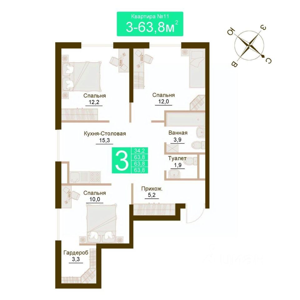 Продаётся 3-комнатная квартира в строящемся доме (Дом 7к1), срок сдачи: II-кв. 2027, общей площадью 63.8 кв.м., на 2 этаже. УМНЫЙ ЖИЛОЙ КОМПЛЕКС