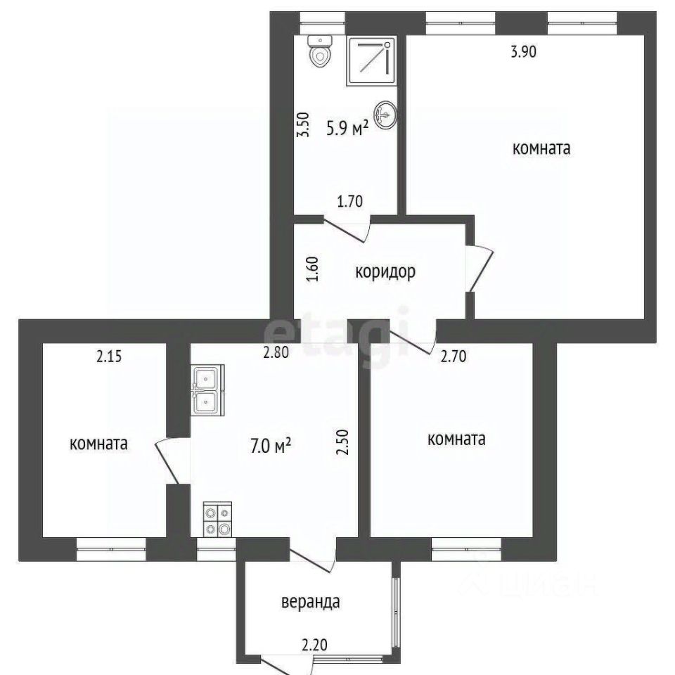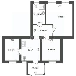 В квартире: две изолированные комнаты, зал, кухня, большой коридор, санузел (совмещенный).