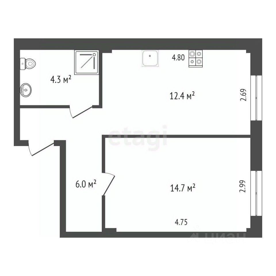 Общая площадь 37.5 м2 из которых 12,4 м2 кухня-гостиная.
