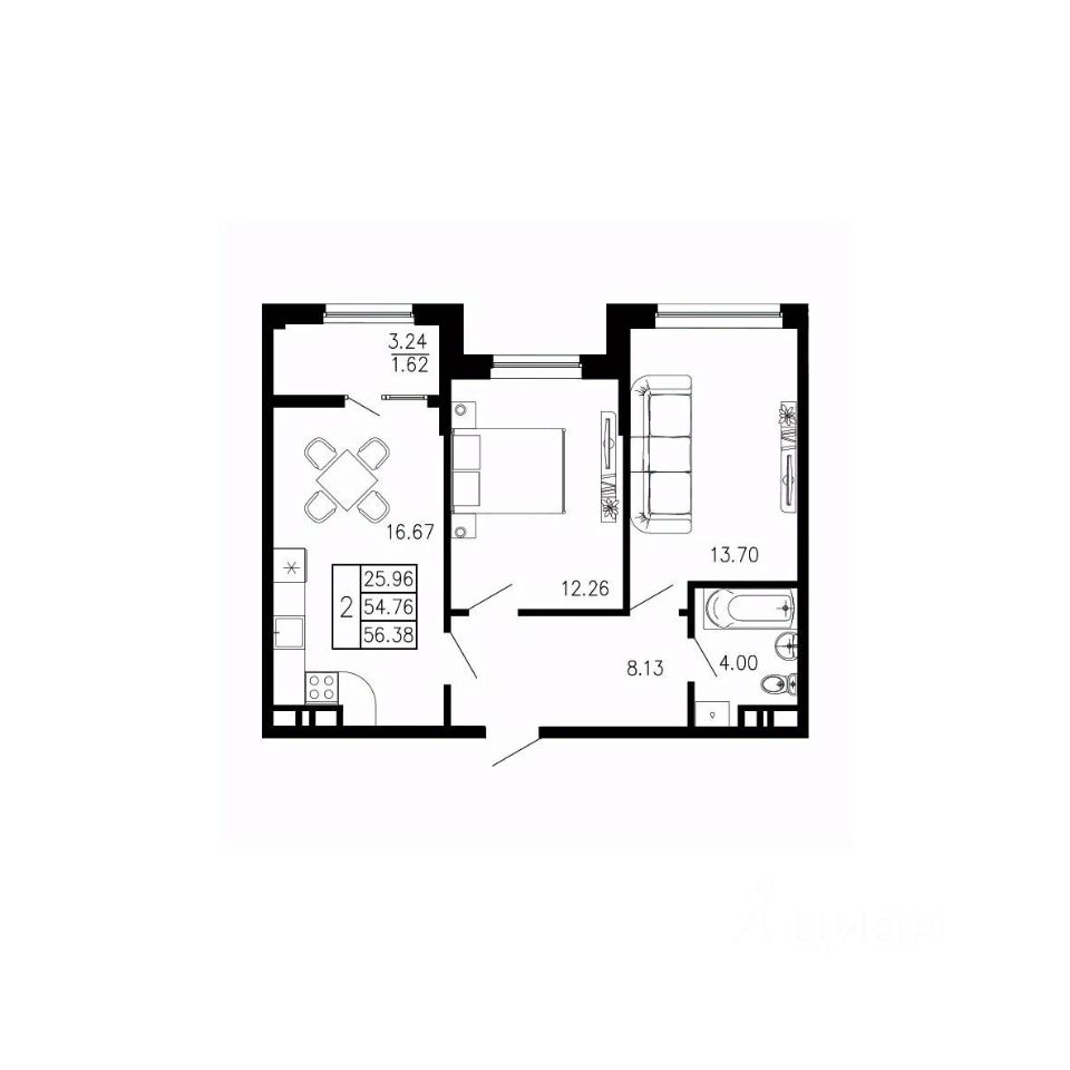 Общая площадь56,38 м²