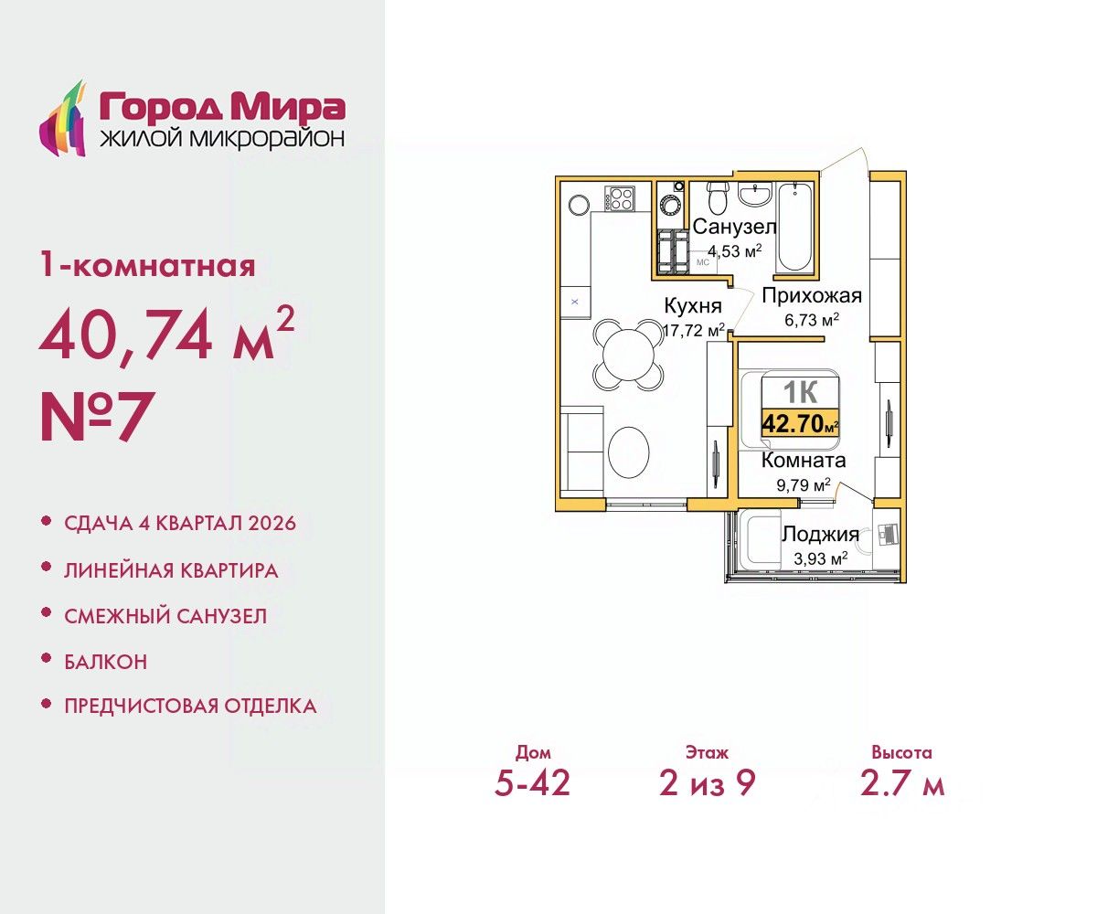 Просторная 1-комн. квартира с предчистовой отделкой в ЖМ "Город Мира" на 2 этаже. Общая площадь: 40.74 кв.м., жилая: 9.79 кв.м., площадь просторной кухни-столовой: 17.72 кв.м. Все окна выходят на одну сторону. В квартире один балкон, один совмещенный санузел. Высота потолков 2.7 м.