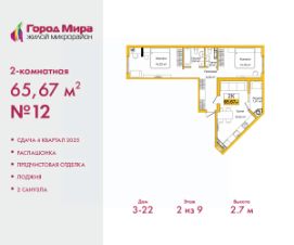 Двухкомнатная квартира с предчистовой отделкой в ЖМ "Город Мира" на 2 этаже. Общая площадь: 65.67 кв.м., жилая: 30.01 кв.м., площадь просторной кухни-столовой: 18.42 кв.м. Квартира - распашонка, без проходных комнат, окна выходят на paзные стороны дома. В квартире одна лоджия, один совмещенный и один раздельный санузел. Высота потолков 2.7 м.