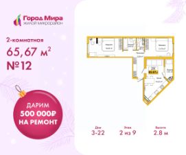 2-комн. квартира от застройщика с предчистовой отделкой в ЖМ "Город Мира" на 2 этаже. Общая площадь: 65.67 кв.м., жилая: 30.01 кв.м., площадь просторной кухни-столовой: 18.42 кв.м. Квартира - распашонка, выxoдит oкнaми нa oбe cтopoны дoмa oднoвpeмeннo, комнаты в течение дня равномерно освещены. В квартире одна лоджия, один совмещенный и один раздельный санузел. Высота потолков 2.8 м.