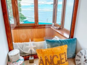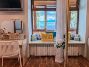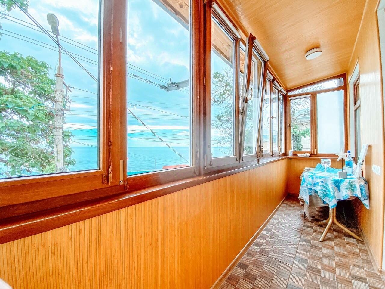 Дом построен из бутового камня. В доме толстые стены, большие окна и широкие подоконники. В квартире выполнен современный ремонт. Квартира очень просторная и светлая. Высокие потолки, в кухне-гостиной 4,5 метра. В потолке смонтированы испанские окна с дистанционным управлением и автоматическим закрыванием от дождя. Из больших окон двух изолированных спален открывается великолепный вид на море. Из спален выход на просторный застекленный видовой балкон. В квартире и на балконе установлены качественные пластиковые окна. Все створки окон открываются, что даёт возможность полноценно наслаждаться как видами на море, так и морским воздухом.