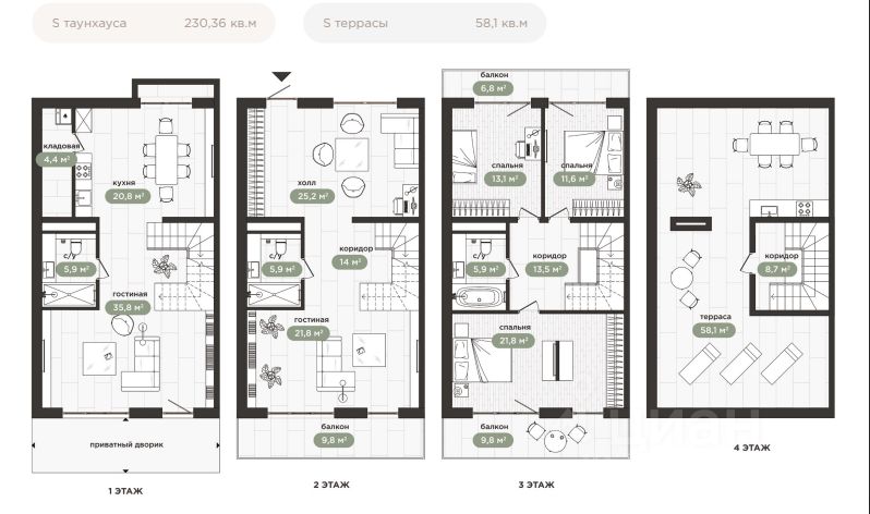 Четырехэтажные комплексы также оборудованы лифтами в концепции "ни одной ступеньки на пути в квартиру", имеют приватные дворики, индивидуальные эксплаутируемые крыши для организации зон отдыха.