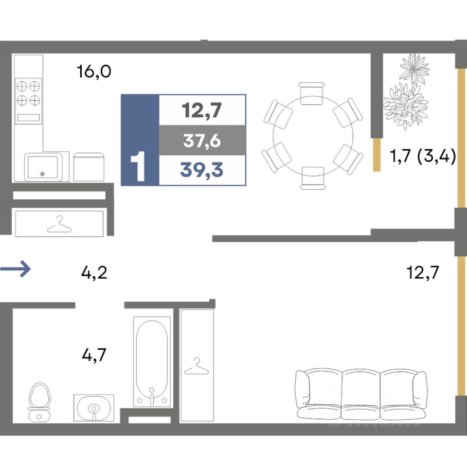 Общая площадь39,3 м²