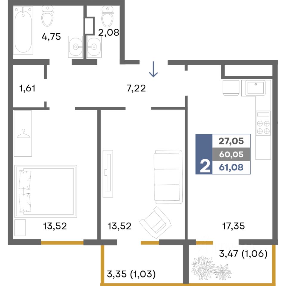 Общая площадь61,08 м²