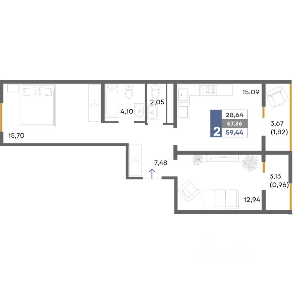 Общая площадь59,44 м²