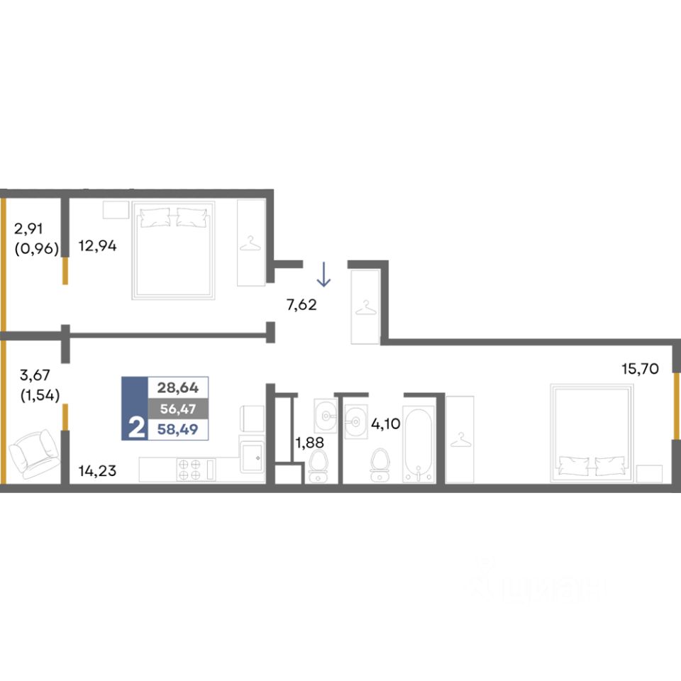 Общая площадь58,49 м²