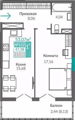 Продаётся 1-комнатная квартира в строящемся доме (С7), срок сдачи: III-кв. 2027, общей площадью 47.38 кв.м., на 9 этаже. Жилой квартал "Абрикос" - начало яркой истории жизни в прогрессивном районе Симферополя - Семья городских кварталов "Крымская Роза".