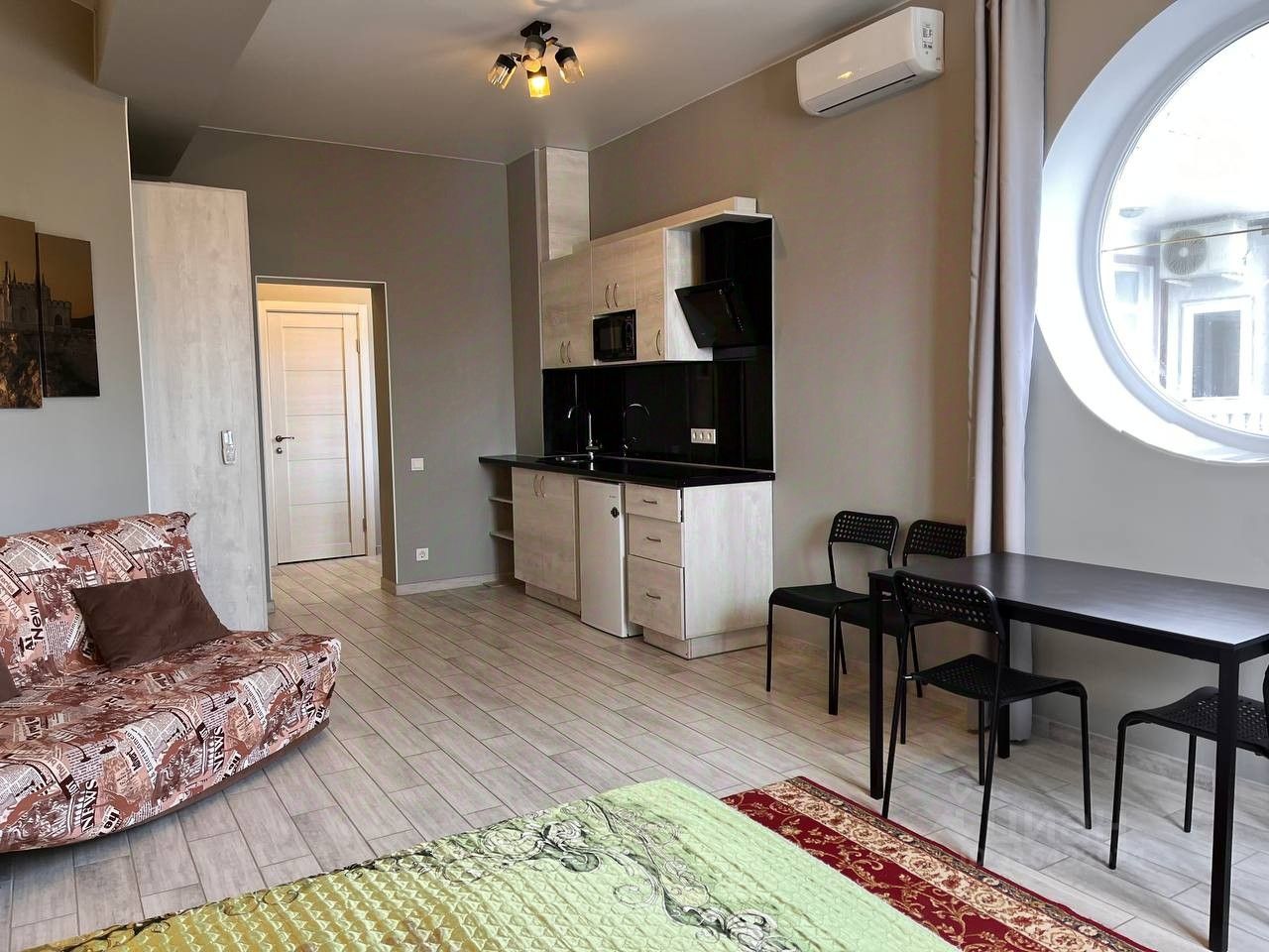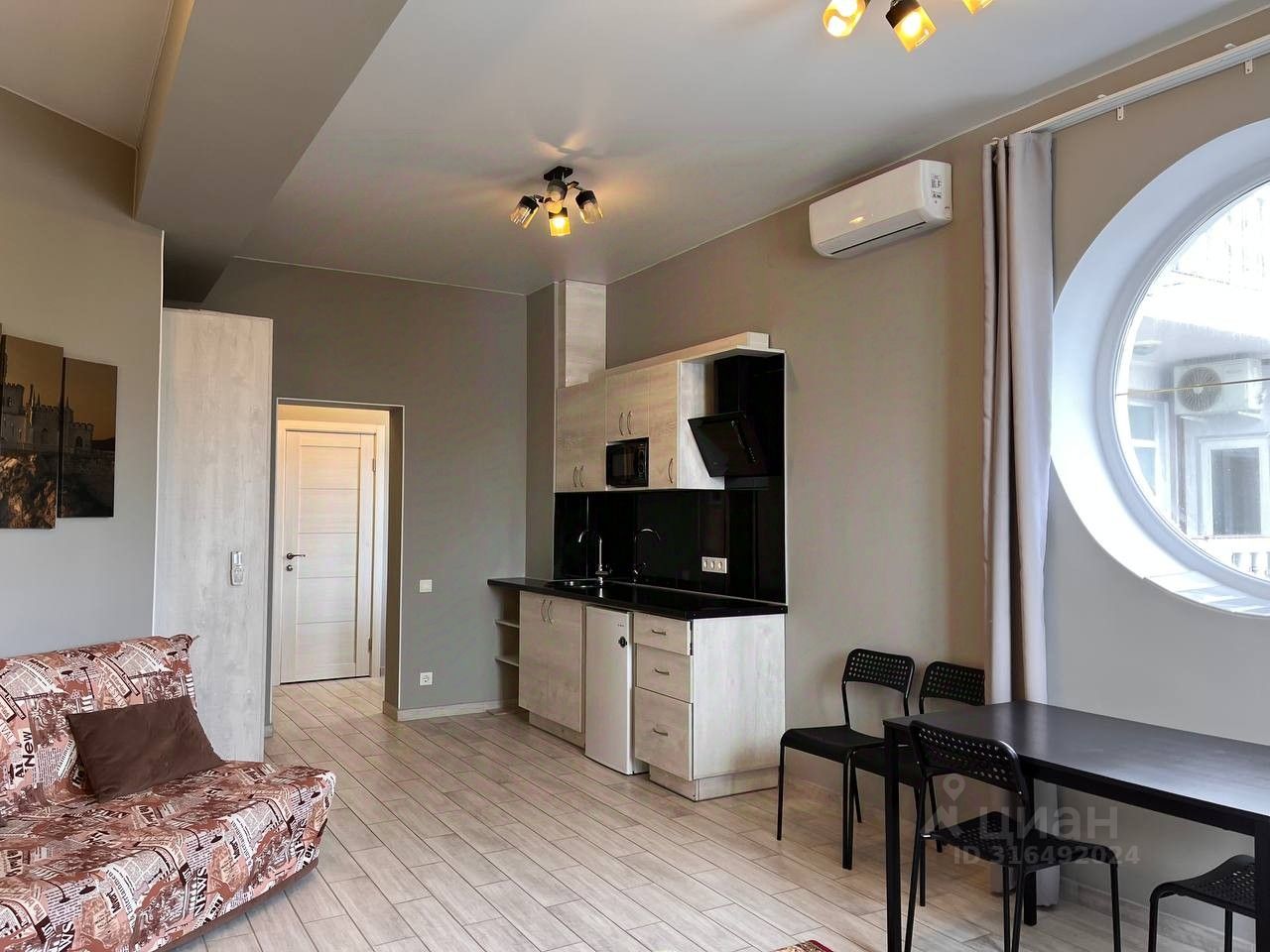 Планировка апартамента-студии: комната общей площадью 32,2 кв.м включающая выделенную зону кухни, совмещенный санузел, прихожая с окном во двор, что дает дополнительное естественное освещение