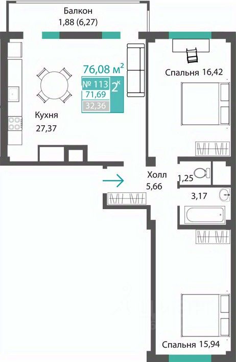 Продаётся 2-комнатная квартира в строящемся доме (ЭТАП 1, СЕКЦИИ А1, А2, А3), срок сдачи: III-кв. 2028, общей площадью 71.69 кв.м., на 8 этаже. Новый жилой комплекс "Семейный квартал ПРОПОЛИС" от застройщика "Монолит" расположен по адресу: Республика Крым, Симферопольский район, с. Мирное, ул. Учительская