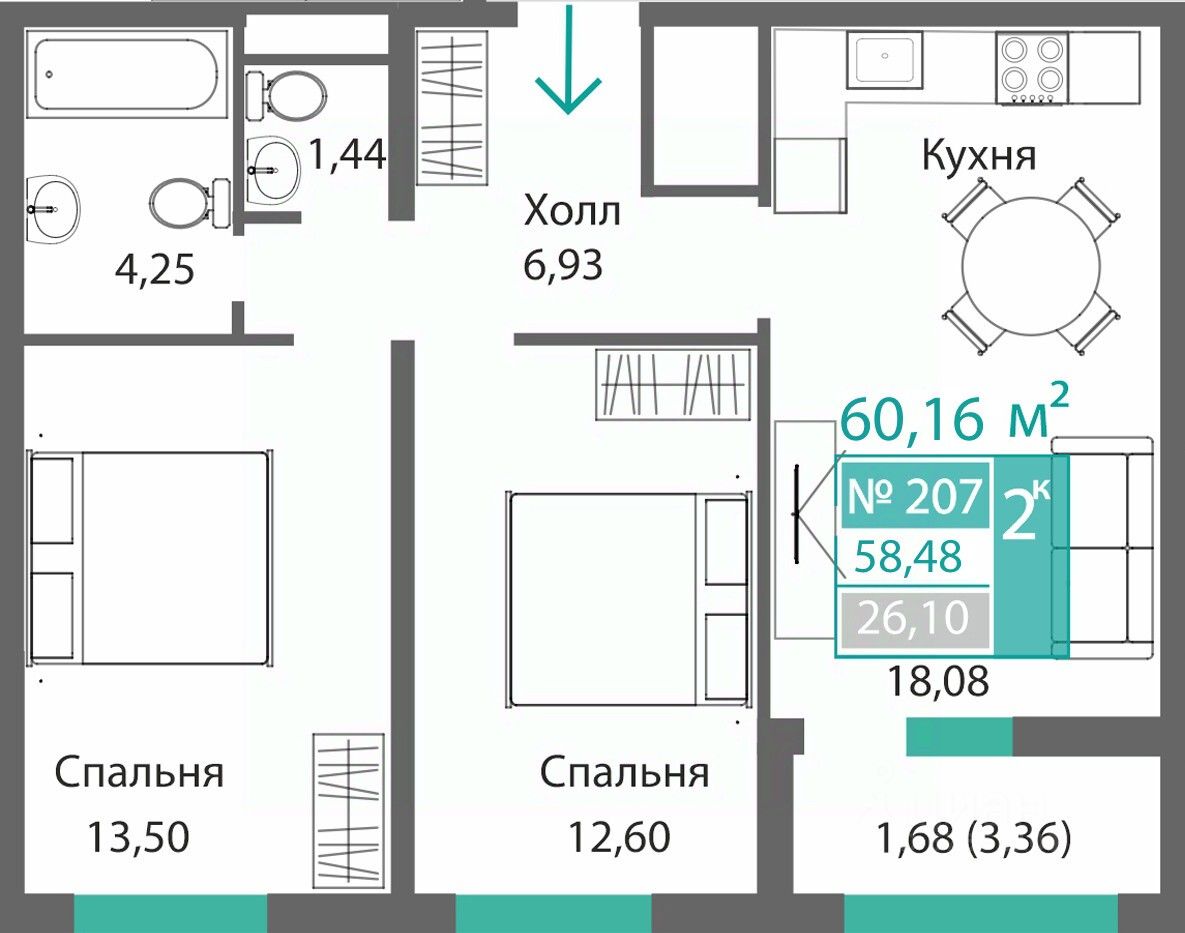 Продаётся 2-комнатная квартира в строящемся доме (Этап 1), срок сдачи: I-кв. 2028, общей площадью 58.48 кв.м., на 2 этаже. Новый жилой комплекс от ГК "Монолит" по адресу: Республика Крым, Симферополь, улица Святителя Гурия