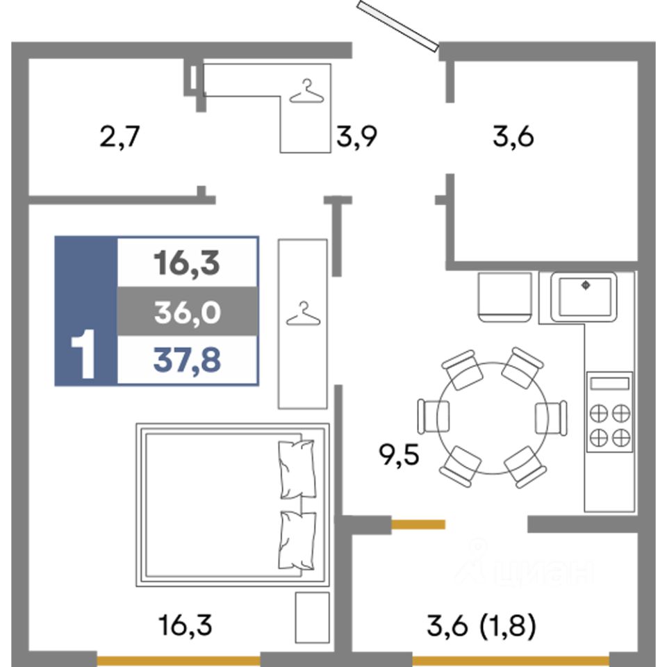 Общая площадь37,8 м²