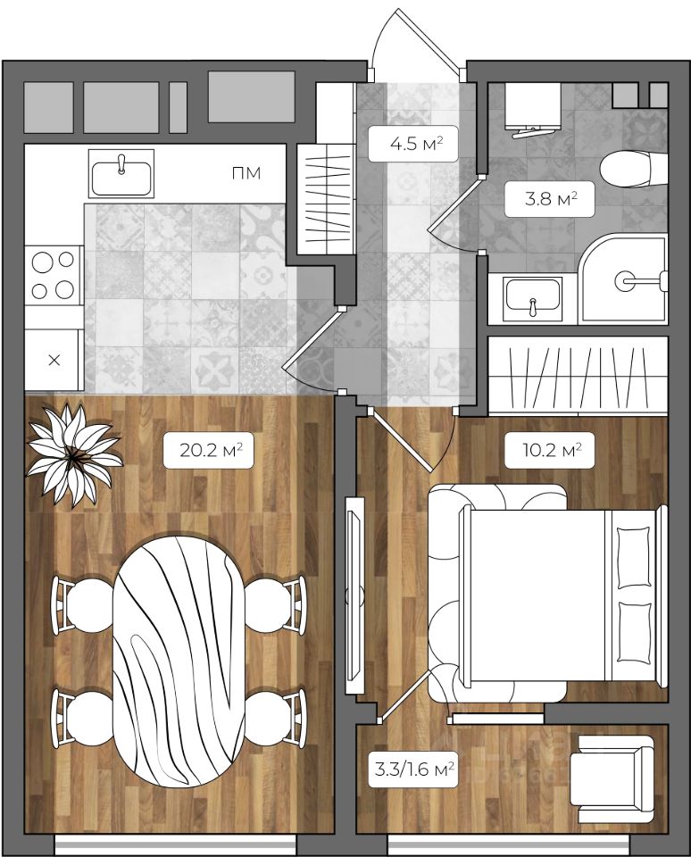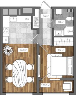- Лоджия (без понижающего коэффициента/ с понижающим коэффициентом)- 3,3 /1,6 м2