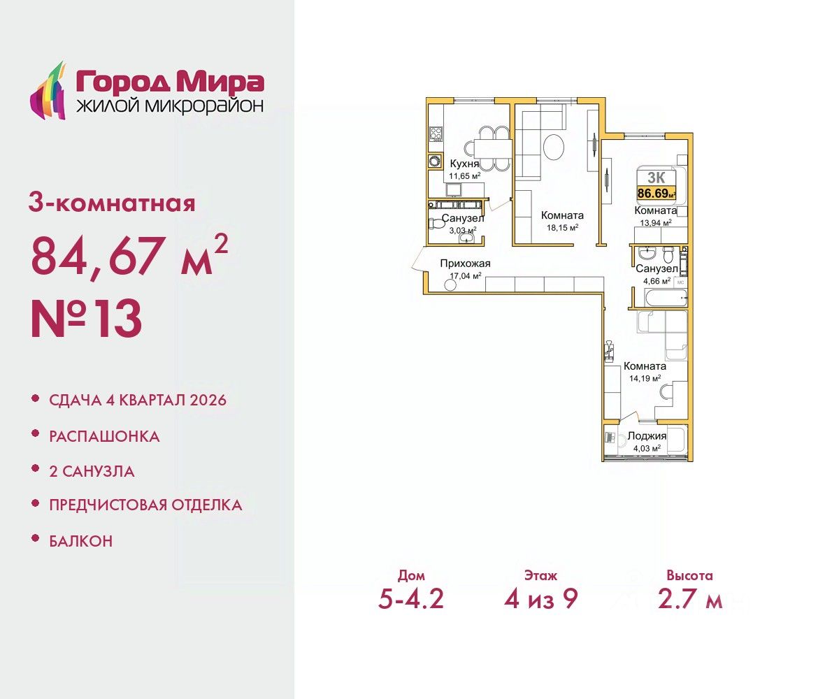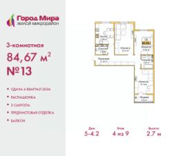 Просторная 3-комн. квартира с предчистовой отделкой в ЖМ "Город Мира" на 4 этаже. Общая площадь: 84.67 кв.м., жилая: 46.28 кв.м., площадь просторной кухни-столовой: 11.65 кв.м. Квартира - распашонка, без проходных комнат, окна выходят на paзные стороны дома. В квартире один балкон, один совмещенный и один раздельный санузел. Высота потолков 3,0 м.