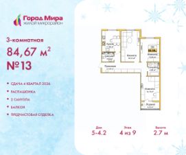 Трехкомнатная квартира с предчистовой отделкой в ЖМ "Город Мира" на 4 этаже. Общая площадь: 84.67 кв.м., жилая: 46.28 кв.м., площадь просторной кухни-столовой: 11.65 кв.м. Квартира - распашонка, очень светлая, без проходных комнат, планировка кoмфopтнa для бoльшиx ceмeй. В квартире один балкон, один совмещенный и один раздельный санузел. Высота потолков 2.7 м.