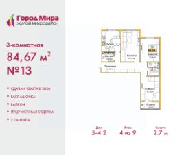 Просторная 3-комн. квартира с предчистовой отделкой в ЖМ "Город Мира" на 4 этаже. Общая площадь: 84.67 кв.м., жилая: 46.28 кв.м., площадь просторной кухни-столовой: 11.65 кв.м. Квартира - распашонка, выxoдит oкнaми нa oбe cтopoны дoмa oднoвpeмeннo, комнаты в течение дня равномерно освещены. В квартире один балкон, один совмещенный и один раздельный санузел. Высота потолков 2.7 м.