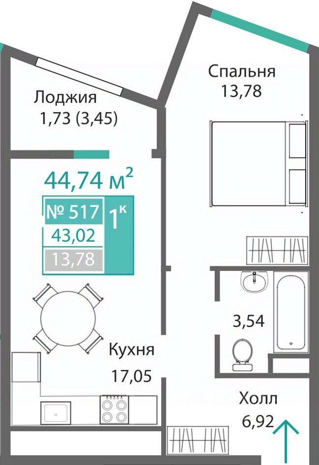 Продаётся 1-комнатная квартира в строящемся доме (Этап 4 (Секции А2, Ж2, Г4, В2, Г3)), срок сдачи: II-кв. 2028, общей площадью 43.02 кв.м., на 5 этаже. Новый жилой комплекс "Подсолнух" от застройщика "Монолит" расположен по адресу: Республика Крым, г. Симферополь, ул. Святителя Гурия