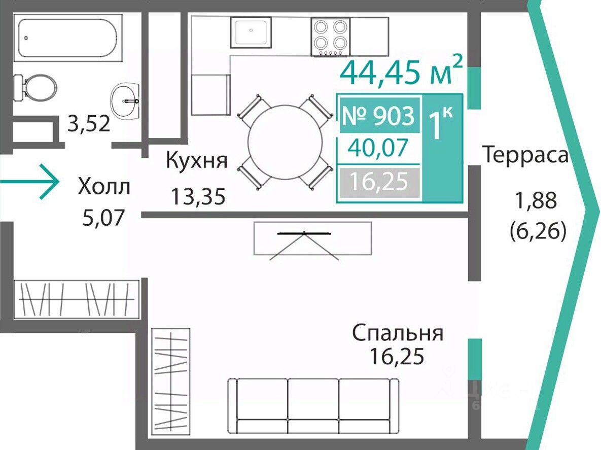Продаётся 1-комнатная квартира в строящемся доме (Этап 4 (Секции А2, Ж2, Г4, В2, Г3)), срок сдачи: II-кв. 2028, общей площадью 40.07 кв.м., на 9 этаже. Новый жилой комплекс "Подсолнух" от застройщика "Монолит" расположен по адресу: Республика Крым, г. Симферополь, ул. Святителя Гурия