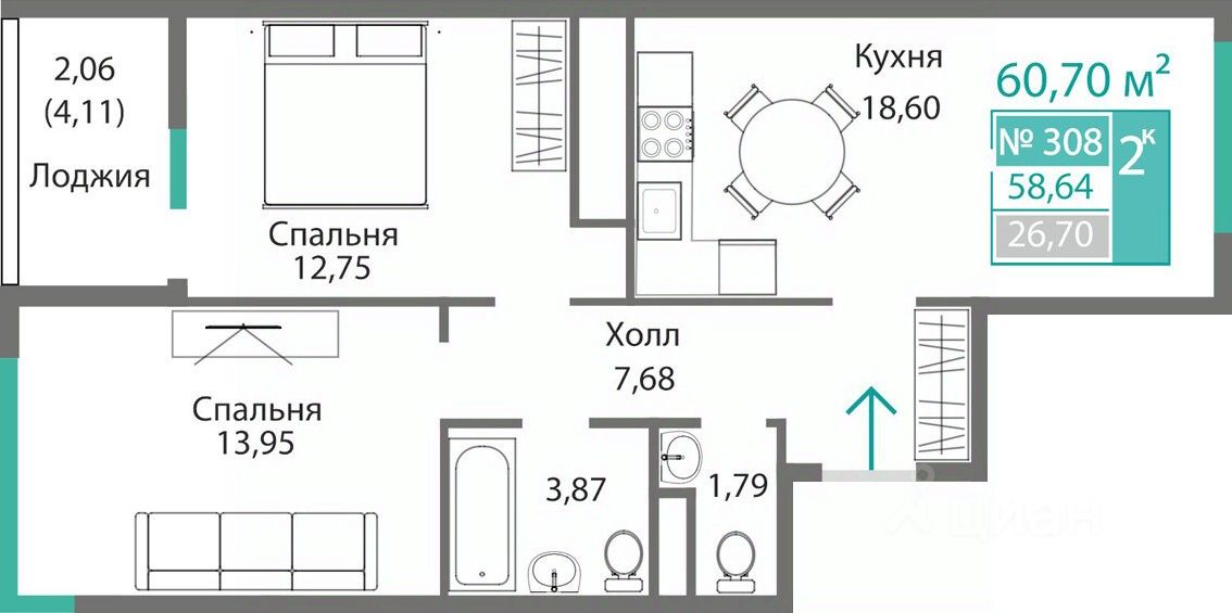 60,7 м²