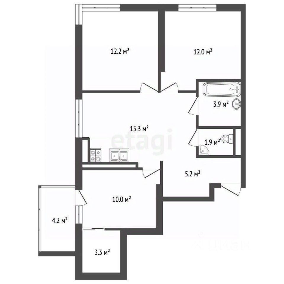 Квартира радует продуманной планировкой: просторная гостиная-кухня-столовая 15,3 м² для семейных встреч, две уютные спальни 12,2 м² и 12,0 м² для отдыха, третья спальня 10,0 м² — для детей или работы. Ванная 3,9 м², туалет 1,9 м² и гардероб 3,3 м² добавят функциональности. Балкон 4,2 м² с панорамным видом станет вашим личным местом для досуга. Площадь 34,2 м² основной зоны позволяет создать неповторимый интерьер.