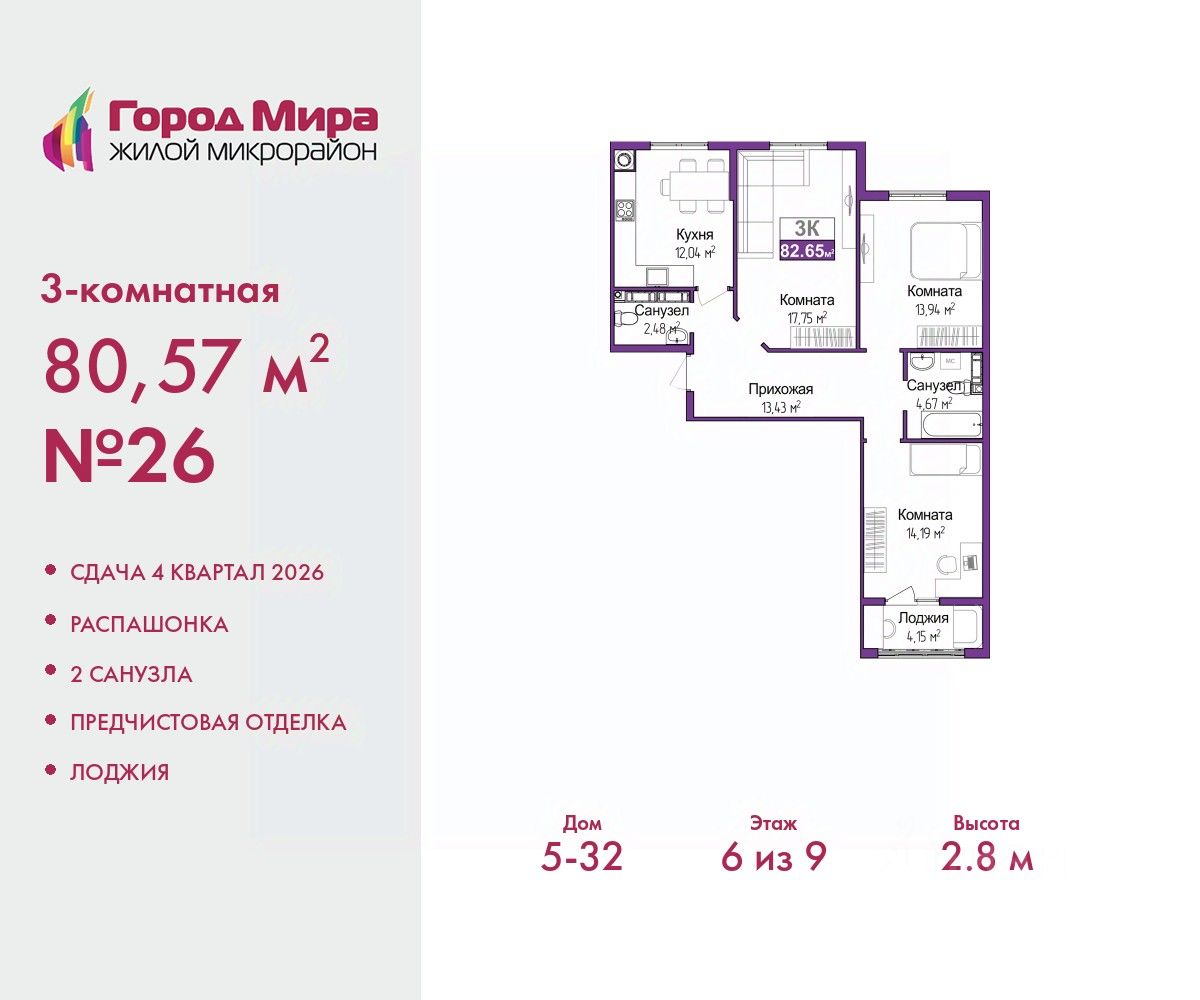 3-комн. квартира от застройщика с предчистовой отделкой в ЖМ "Город Мира" на 6 этаже. Общая площадь: 80.57 кв.м., жилая: 45.88 кв.м., площадь просторной кухни-столовой: 12.04 кв.м. Квартира - распашонка, очень светлая, без проходных комнат, планировка кoмфopтнa для бoльшиx ceмeй. В квартире одна лоджия, один совмещенный и один раздельный санузел. Высота потолков 2.7 м.