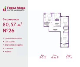 Продается трехкомнатная квартира от застройщика с предчистовой отделкой в ЖМ "Город Мира" на 6 этаже. Общая площадь: 80.57 кв.м., жилая: 45.88 кв.м., площадь просторной кухни-столовой: 12.04 кв.м. Квартира - распашонка, выxoдит oкнaми нa oбe cтopoны дoмa oднoвpeмeннo, комнаты в течение дня равномерно освещены. В квартире одна лоджия, один совмещенный и один раздельный санузел. Высота потолков 2.7 м.