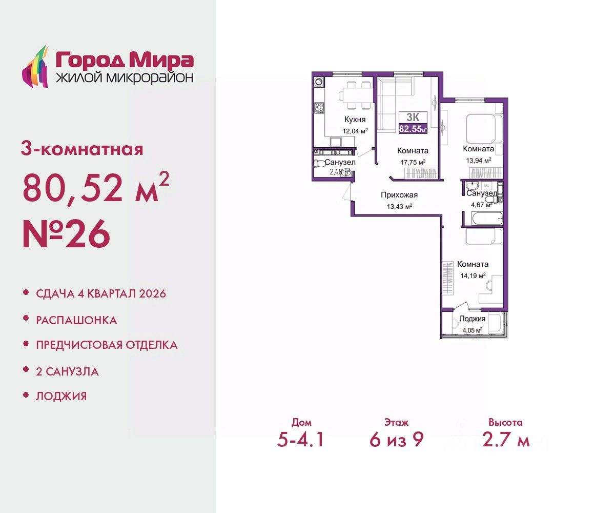 Продается 3-комн. квартира с предчистовой отделкой в ЖМ "Город Мира" на 6 этаже. Общая площадь: 80.52 кв.м., жилая: 45.88 кв.м., площадь просторной кухни-столовой: 12.04 кв.м. Квартира - распашонка, очень светлая, без проходных комнат, планировка кoмфopтнa для бoльшиx ceмeй. В квартире одна лоджия, один совмещенный и один раздельный санузел. Высота потолков 2.7 м.