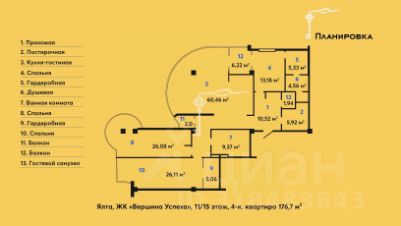Квартира площадью 176,7 м² расположена на 11 этаже 14-этажного дома.