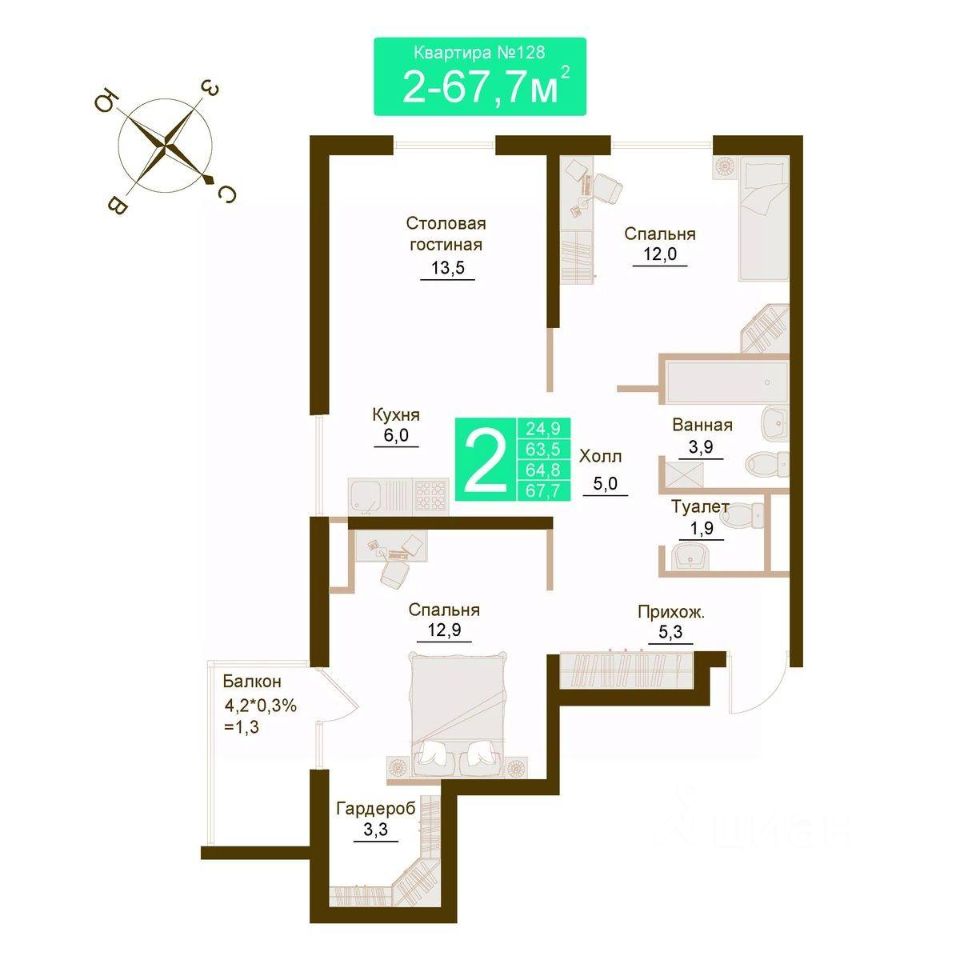 Общая площадь64,8 м²