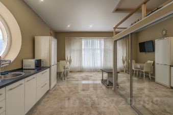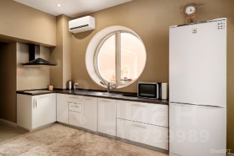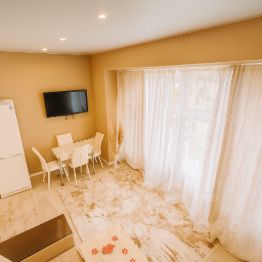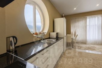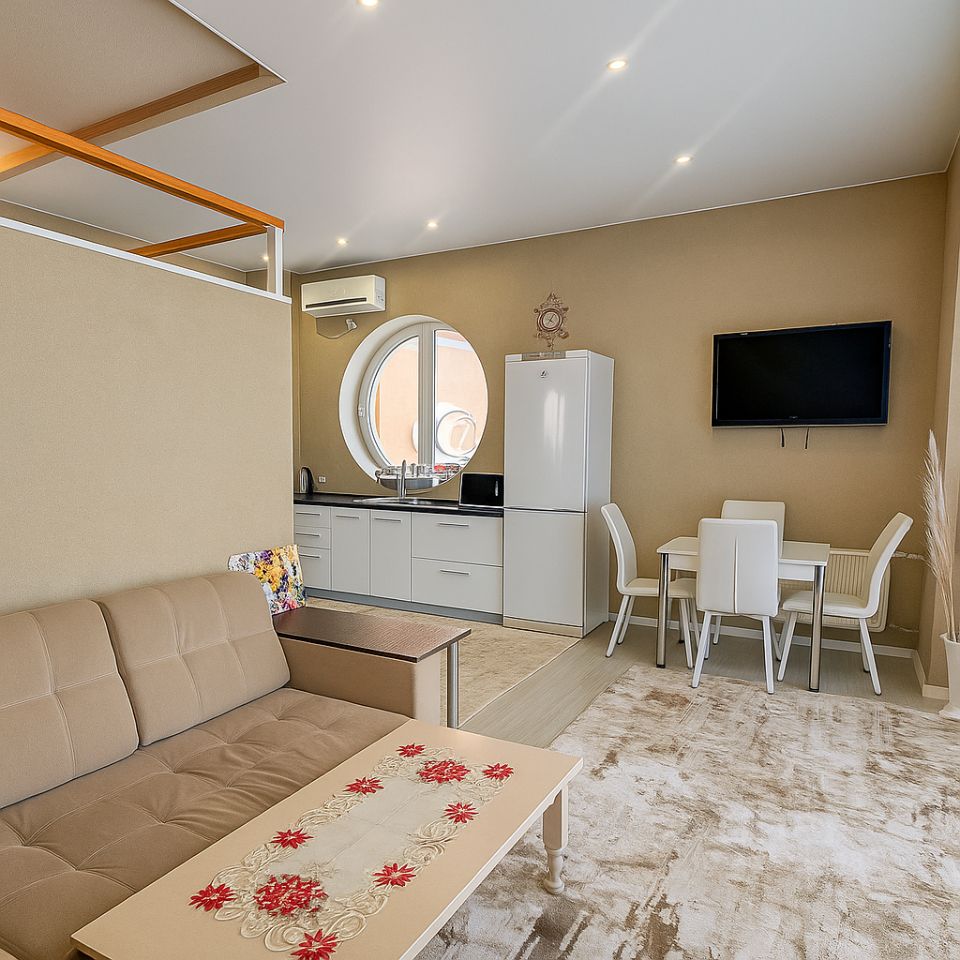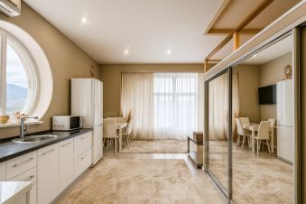 Кухонная зона с уникальным панорамным круглым окном, выходящим на горы, превращает процесс приготовления пищи в настоящее удовольствие. Высокие потолки и второй ярус, где расположено спальное место, добавляют пространству объем и функциональность. В квартире предусмотрено множество мест для хранения вещей, что обеспечивает порядок и комфорт.