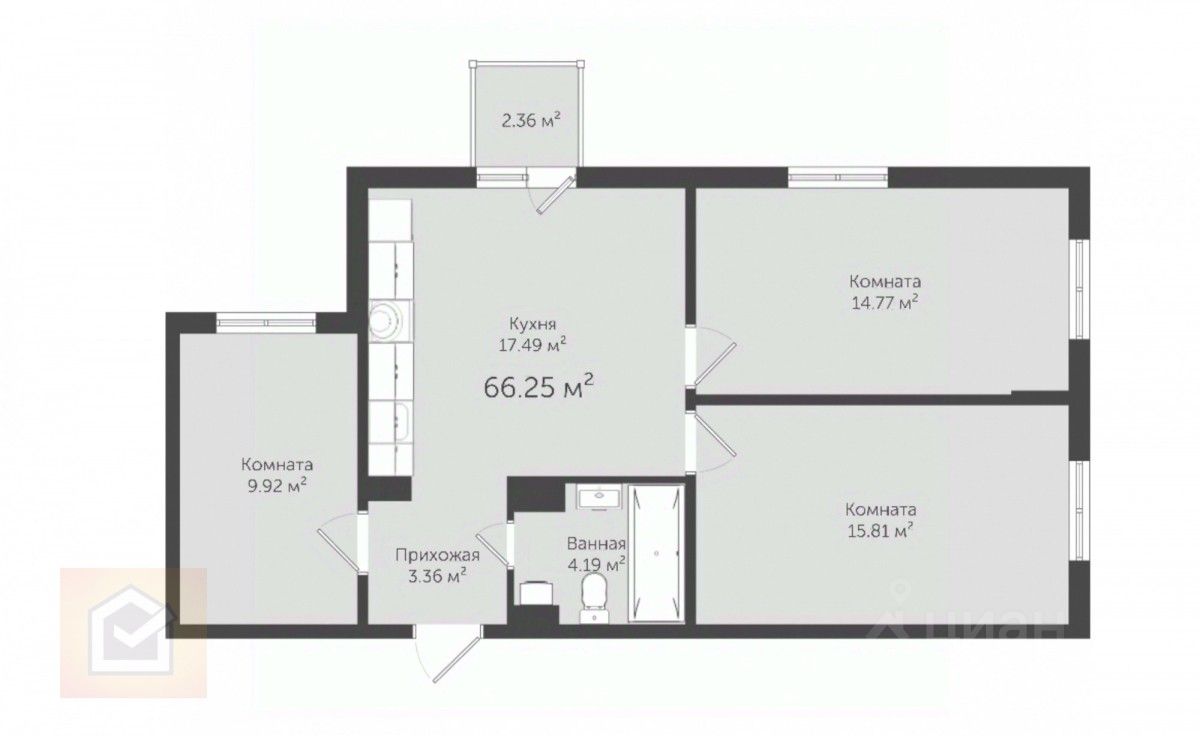 Общая квадратура 66,3 квадратных метров,позволит разметить всю необходимую мебель и технику по вашему вкусу, никак не стесняя пространства!