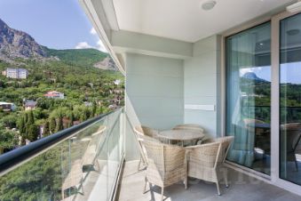 одну спальню с выходом на террасу с которой открываются лучшие виды на море, парк и горы;