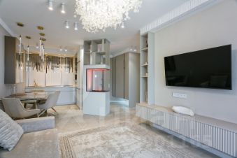 В квартире выполнен ремонт в соответствии с последними трендами дизайна. Вся мебель была изготовлена на заказ и отличается высоким качеством. На террасе стильная дизайнерская плитка .