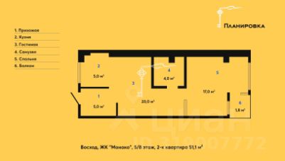 Квартира площадью 51,1 м² + открытый балкон 1,8 м² находится на 5 этаже 8-этажного дома.