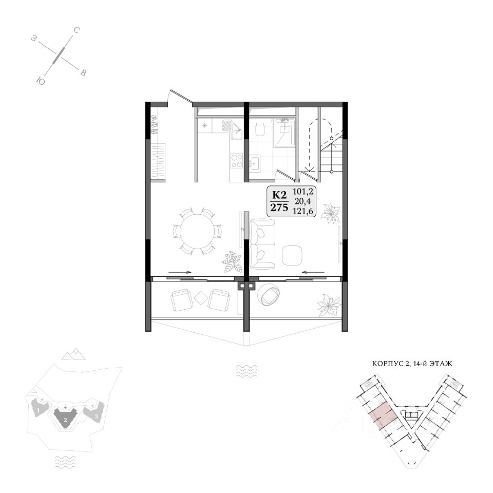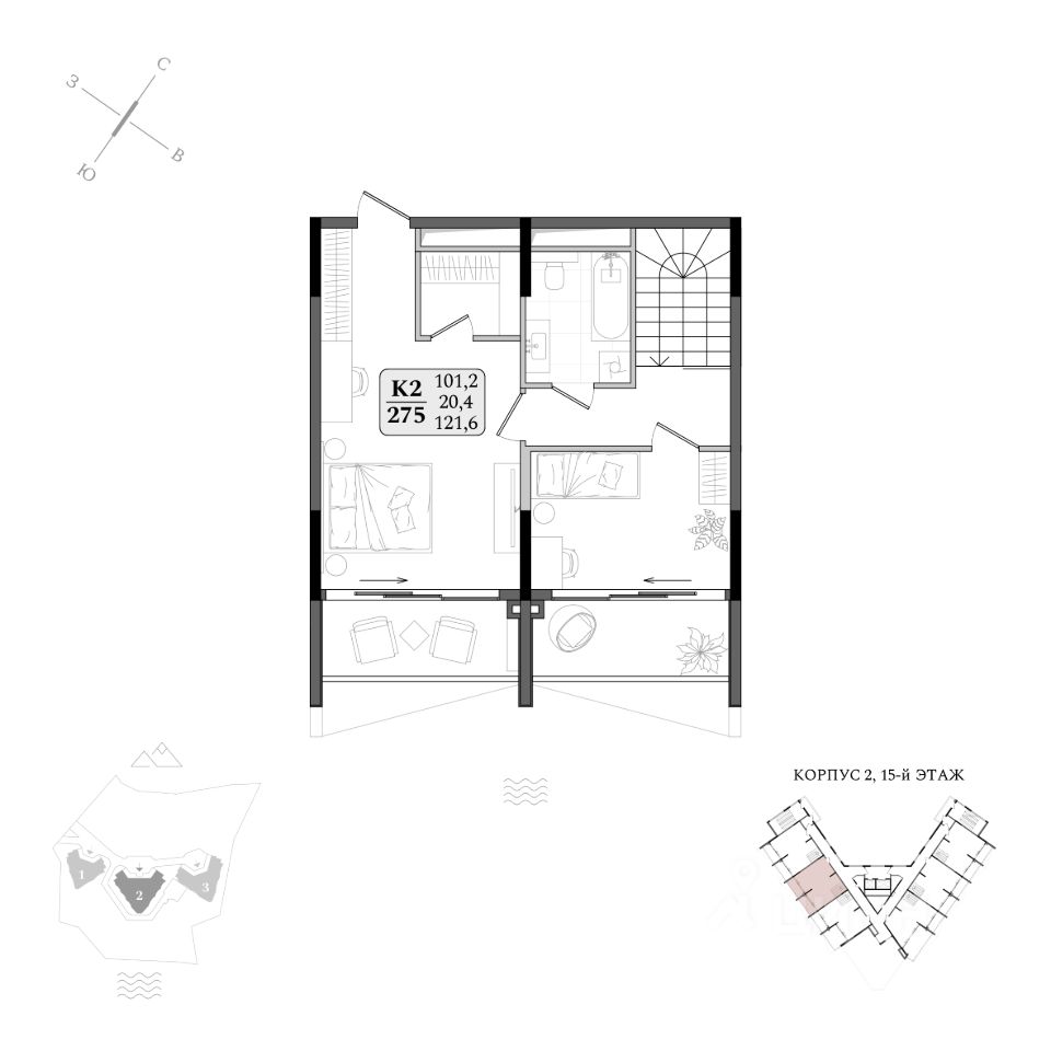В комплексе представлена широкая линейка планировочных решений от студий до двухуровневых пентхаусов на последних этажах.