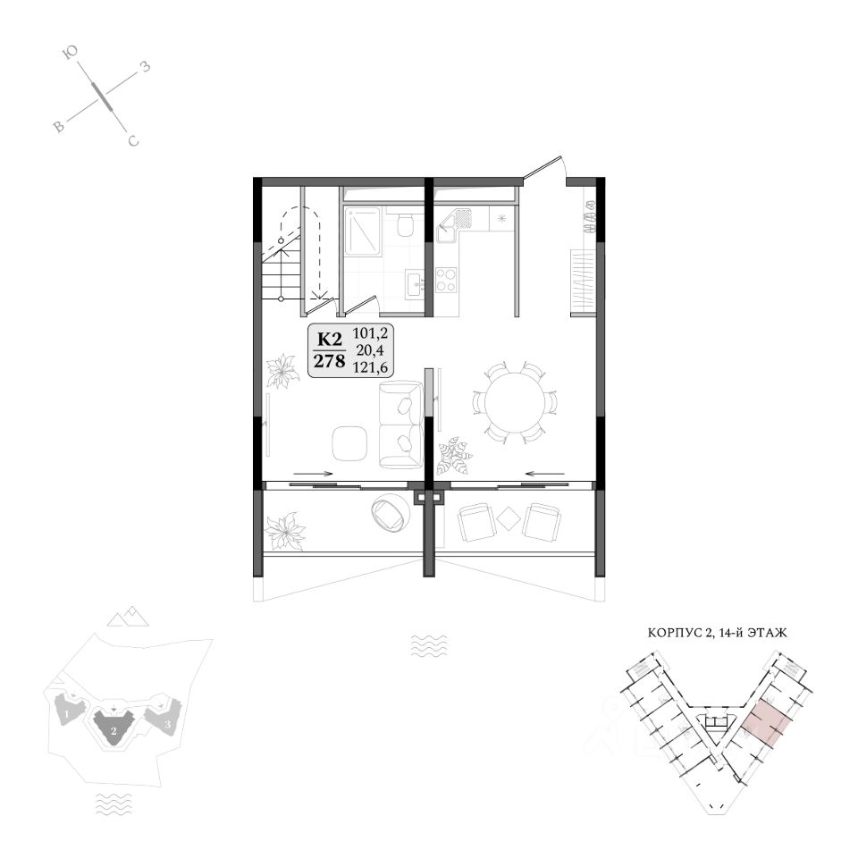 В комплексе представлена широкая линейка планировочных решений от студий до двухуровневых пентхаусов на последних этажах.