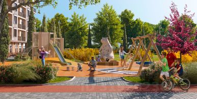 Полностью готовая среда — магазины, кафе, рестораны, прогулочные зоны, ландшафтный парк, двор без машин, спортивные и детские площадки.