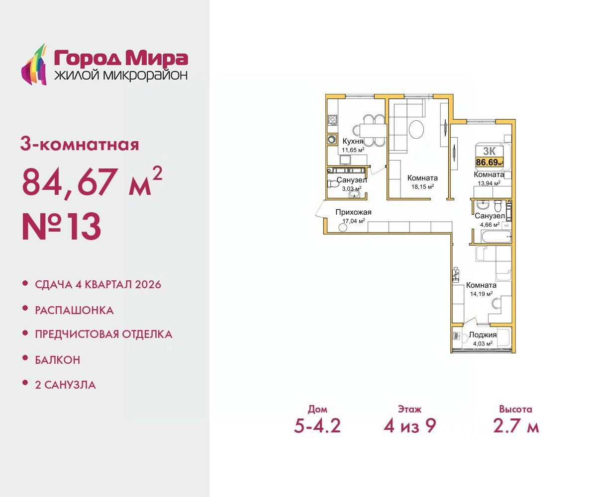 Просторная 3-комн. квартира с предчистовой отделкой в ЖМ "Город Мира" на 4 этаже. Общая площадь: 84.67 кв.м., жилая: 46.28 кв.м., площадь просторной кухни-столовой: 11.65 кв.м. Квартира - распашонка, без проходных комнат, окна выходят на paзные стороны дома. В квартире один балкон, один совмещенный и один раздельный санузел. Высота потолков 2.7 м.