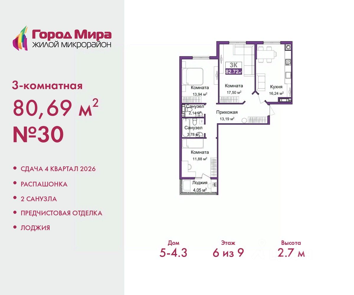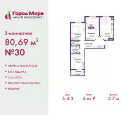 3-комн. квартира с предчистовой отделкой в ЖМ "Город Мира" на 6 этаже. Общая площадь: 80.69 кв.м., жилая: 43.32 кв.м., площадь просторной кухни-столовой: 16.24 кв.м. Квартира - распашонка, без проходных комнат, окна выходят на paзные стороны дома. В квартире одна лоджия, один совмещенный и один раздельный санузел. Высота потолков 3,0 м.