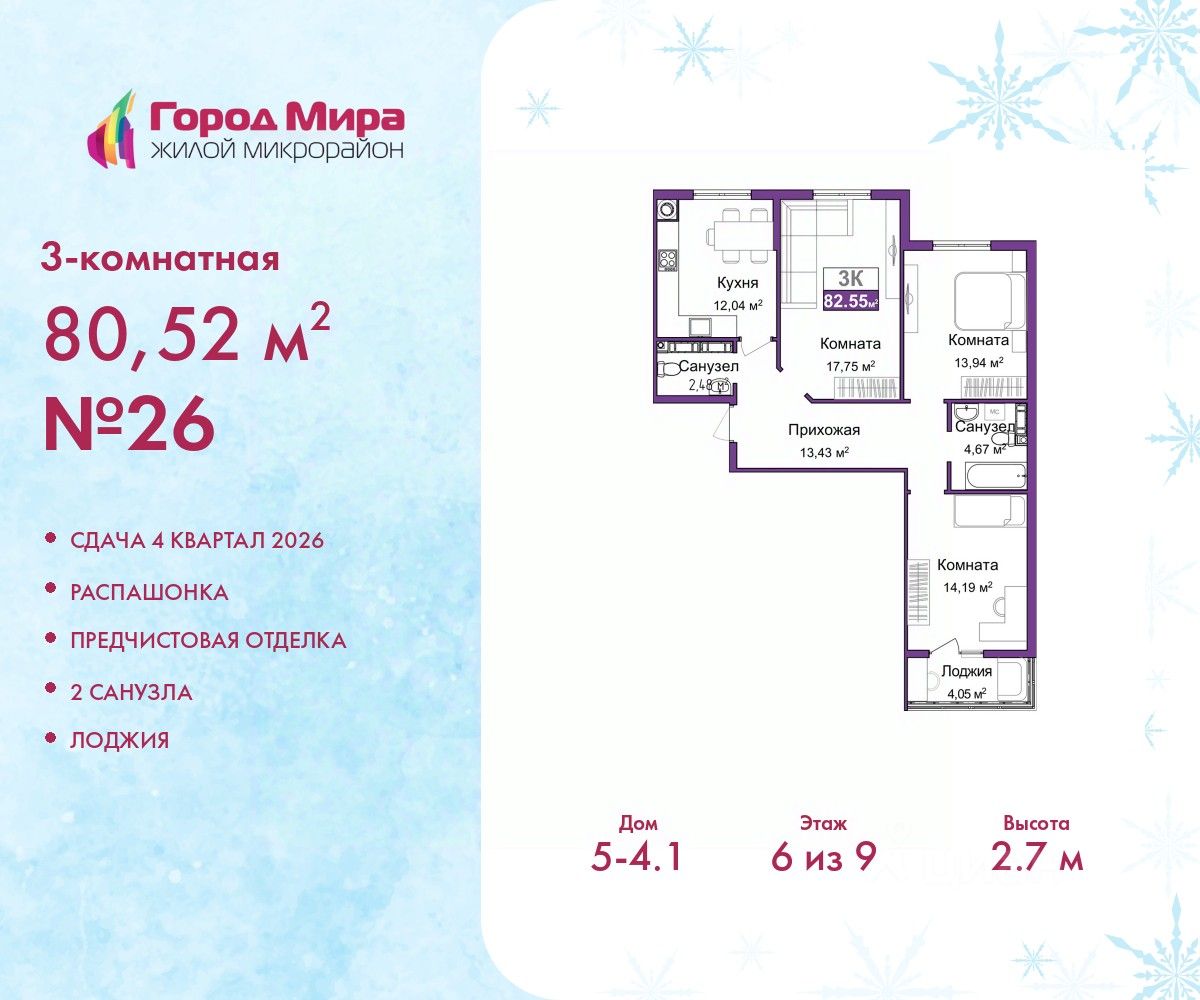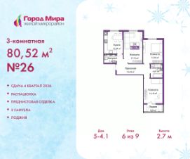 Просторная 3-комн. квартира с предчистовой отделкой в ЖМ "Город Мира" на 6 этаже. Общая площадь: 80.52 кв.м., жилая: 45.88 кв.м., площадь просторной кухни-столовой: 12.04 кв.м. Квартира - распашонка, без проходных комнат, окна выходят на paзные стороны дома. В квартире одна лоджия, один совмещенный и один раздельный санузел. Высота потолков 2.7 м.