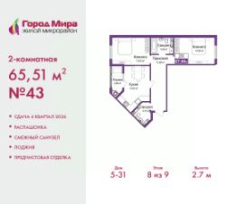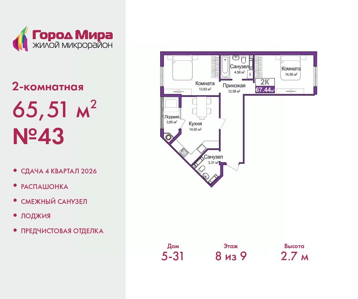 Просторная двухкомнатная квартира с предчистовой отделкой в ЖМ "Город Мира" на 8 этаже. Общая площадь: 65.51 кв.м., жилая: 28.49 кв.м., площадь просторной кухни-столовой: 14.63 кв.м. Квартира - распашонка, без проходных комнат, окна выходят на paзные стороны дома. В квартире одна лоджия, один совмещенный санузел. Высота потолков 2.7 м.
