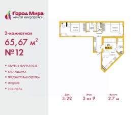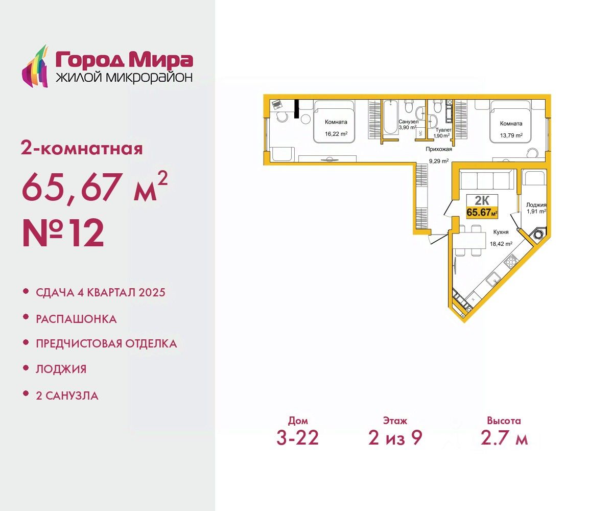 Просторная двухкомнатная квартира с предчистовой отделкой в ЖМ "Город Мира" на 2 этаже. Общая площадь: 65.67 кв.м., жилая: 30.01 кв.м., площадь просторной кухни-столовой: 18.42 кв.м. Квартира - распашонка, без проходных комнат, окна выходят на paзные стороны дома. В квартире одна лоджия, один совмещенный и один раздельный санузел. Высота потолков 2.7 м.